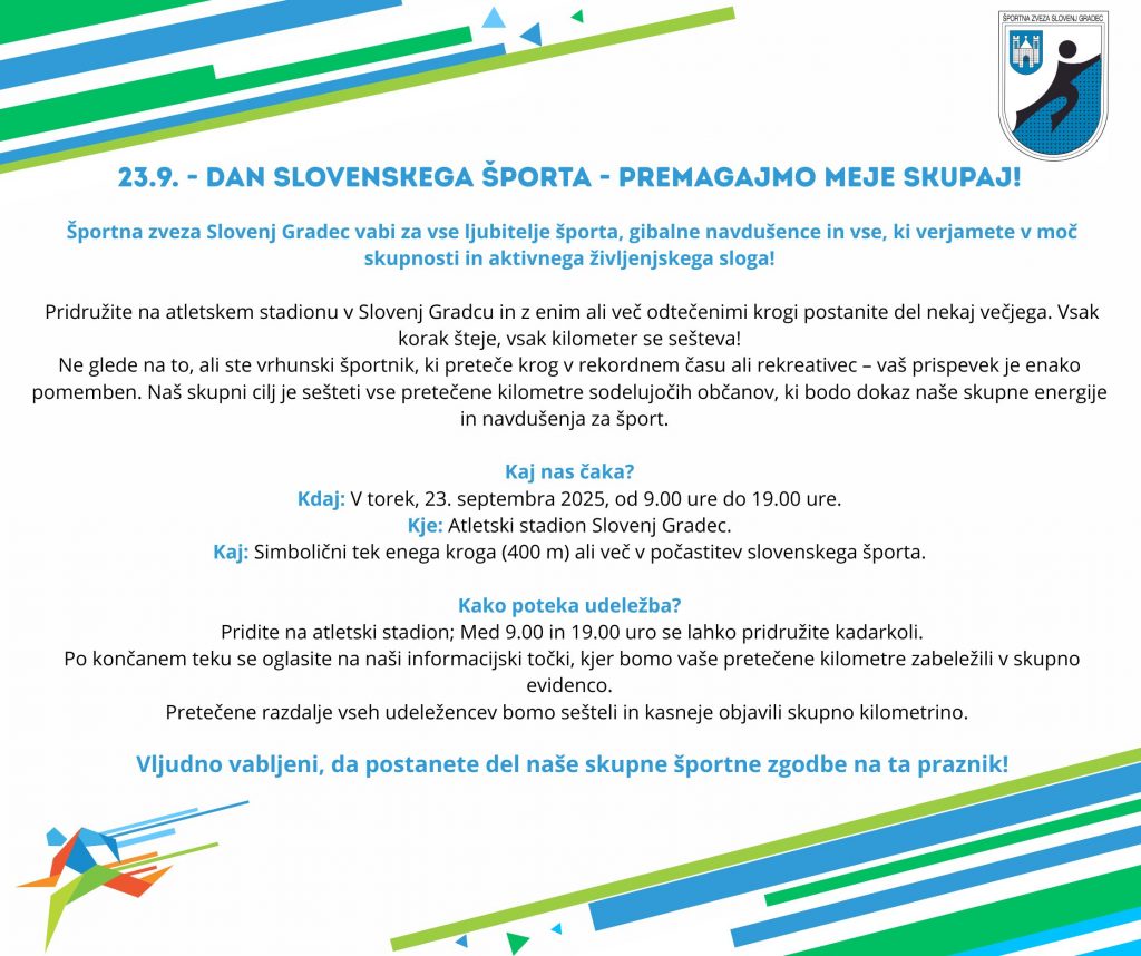 Vabilo: 23.9.2025 – Dan slovenskega športa – Nabiranje skupnih kilometrov!